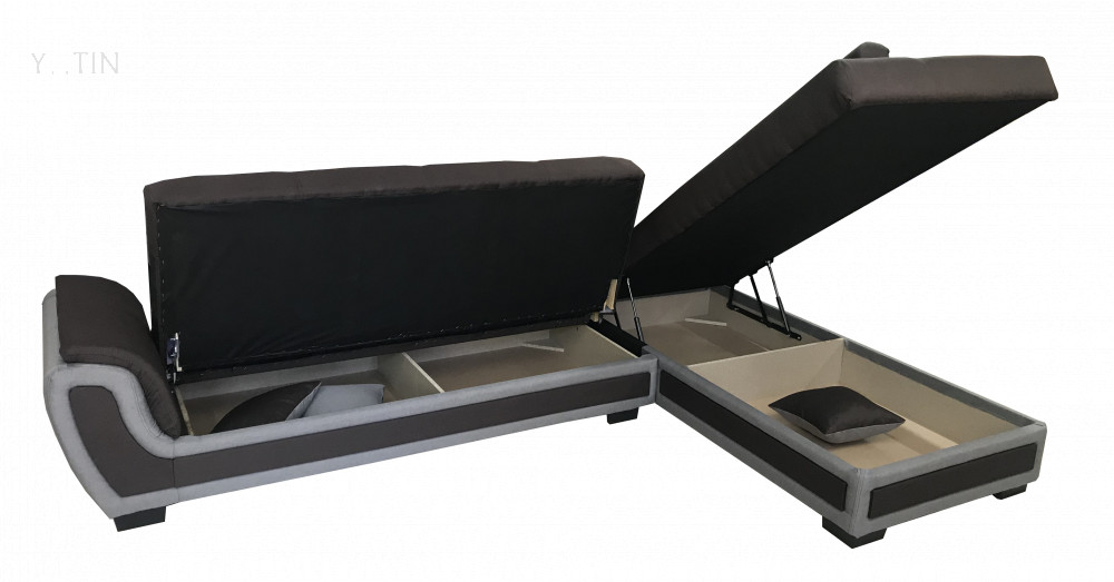 Стилен и уютен холов ъгъл включващ диван с клик-клак механизъм и лежанка. По този начин си осигурявате достатъчно голямо и удобно легло, което може да ползвате, когато ви е необходимо допълнително място за сън. Лежанката се повдига странично и разкрива практична ракла, подходяща за съхранение на багаж. Можете да откриете още една ракла под седалната част.