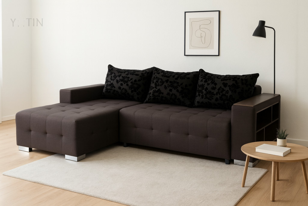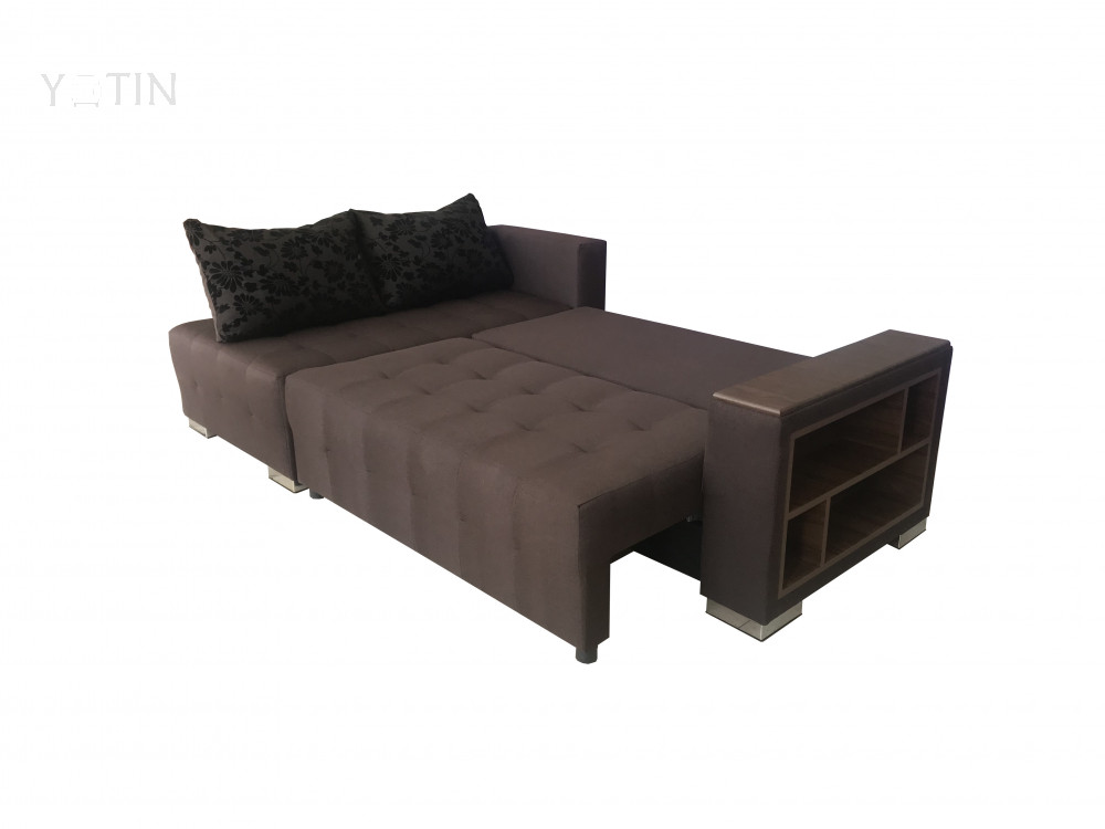 Стилен холов ъгъл с функция сън. Модела лесно се трансформира в легло, чрез падащ гръб. При издърпване на седалната част се разкрива практична ракла, гърба пада и заедно със седалката образуват достатъчно голяма и комфортна спалня. По този начин си осигурявате достатъчно голямо и удобно легло, което може да ползвате, когато ви е необходимо допълнително място за сън. Холният ъгъл има удобна вградена етажерка в подлакътника.