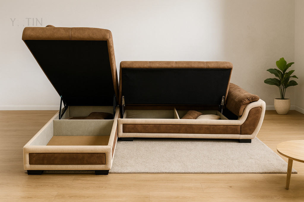Стилен и уютен холов ъгъл включващ диван с клик-клак механизъм и лежанка. По този начин си осигурявате достатъчно голямо и удобно легло, което може да ползвате, когато ви е необходимо допълнително място за сън. Лежанката се повдига странично и разкрива практична ракла, подходяща за съхранение на багаж. Можете да откриете още една ракла под седалната част.